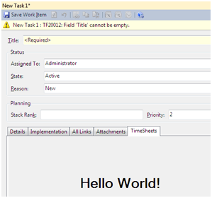 This post (Step 1, Getting Started) will cover the process of setting up the required project and setup files, creating a basic ‘Hello World’ custom work item control and loading that control into the work item interface.