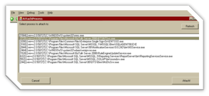 Once the assemblies have been loaded we need to attach Deblector to the process to be debugged. In my case this was the BTSNTSvc.exe process.