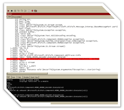 As a matter of interest, was there a reason for not (a) decompiling into C# (or VB), and (b) using Visual Studio via the Reflector Pro plug-in (14 day trial 🙂 for stepping through? Is there some problem with trying this with Biztalk?