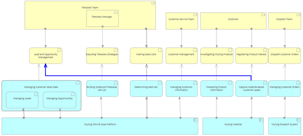 - Following potentially multiple overlapping relationships, as demonstrated with the bold-blue serving relationship between “Customer Website Based Customer Leads” application function and “Managing Customer Leads and Opportunities” business function. Only a single example of this has been included on this diagram, but in reality there are likely to be many instances of crossing-line relationships, making the diagram look a bit like spaghetti.
